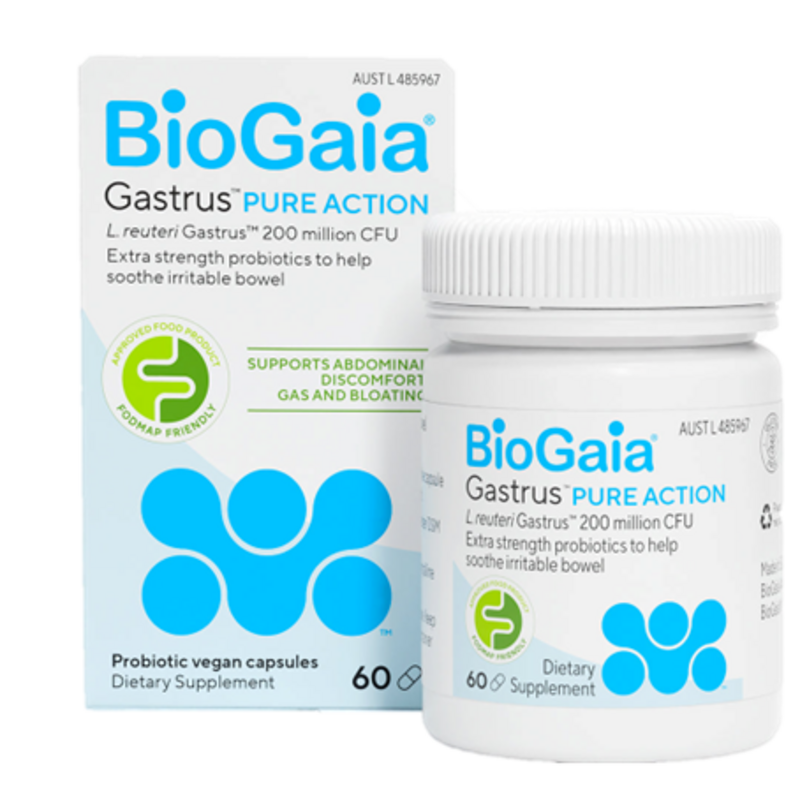BioGaia Gastrus PureAction is a vegan probiotic food supplement with clinically proven L. reuteri strains that naturally support digestive balance and gastrointestinal health. Certified FODMAP (Fermentable Oligosaccharides, Disaccharides, Monosaccharides, and Polyols) friendly and safe for daily and long-term use.